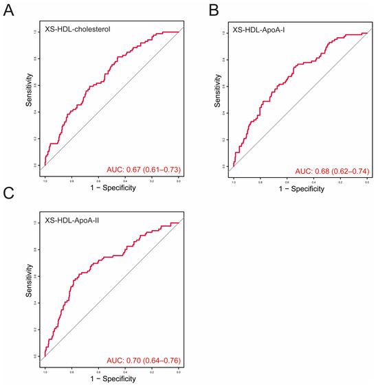 Receiver operating characteristic (ROC) curves for predicting all-cause mortality in CKD patients based on (A) cholesterol, (B) ApoA-I, and (C) ApoA-II levels within the XS-HDL subclass.