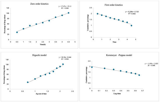 The in vitro dissolution test data were fitted into mathematical models representing (i) fero order, (ii) first order, (iii) Higuchi’s, and (iv) Korsmeyer–Peppas model.