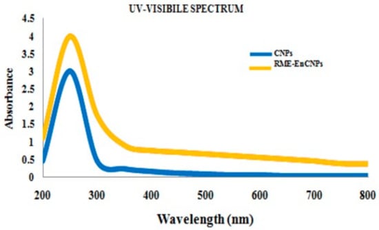 Chitosan nanoparticles (CNPs) and root methanolic extract-encapsulated chitosan nanoparticles (RME-EnCNPs) were subjected to various spectroscopy characterization studies.