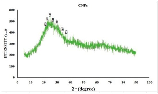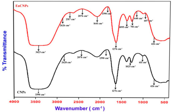 Fourier transform infrared spectroscopy (FTIR) is a technique used to obtain the infrared spectrum of absorption, emission, and photoconductivity in solids, liquids, and gasses. It is employed to detect various functional groups in a sample, and the spectrum corresponds to specific rotations around carbon atoms. FTIR analysis is performed to analyze the formation of CNPs and RME-EnCNPs. After preparing samples with KBr in pellet form, the spectra were recorded using FTIR at room temperature. The scan range was 4000 to 400 cm−1 at a resolution of 4 cm−1 [22].