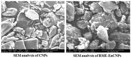 The topography of RME-EnCNPs was examined using a Quanta 400 ESEM/EDAX (FEI). Small amounts of vacuum-dried nanochitosan samples were placed on an SEM stub using double-sided adhesive tape and subjected to sputter coating at 50 mA for 6 min. Subsequently, the stub containing the sample was positioned in the scanning electron microscopy (SEM) chamber, and a photomicrograph was captured at an acceleration voltage of 20 kV.