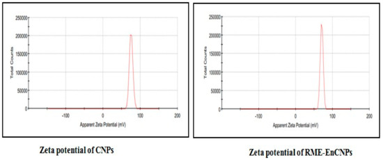 The zeta potential of RME and RME-EnCNPs was analyzed using a laser light scattering-based particle analyzer. The analysis was conducted in triplicate, and average values along with standard deviations were recorded.