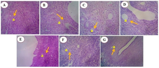 The separated serum from all seven groups of animals was used for the estimation of various parameters, including protein, bilirubin, serum glutamic oxaloacetic transaminase (SGOT), Serum Glutamic Pyruvic Transaminase (SGPT), alkaline phosphatase (ALP), estrogen hormone, progesterone hormone, total cholesterol, triglycerides, HDL-cholesterol, urea, uric acid, and creatinine. These analyses were performed using a semi-auto analyzer (RIELE Photometer 5010 V5+, RIELE, New Delhi, India), and standard enzymatic kits were procured from Piramal Healthcare Limited, Lab Diagnostic Division, Mumbai, India.