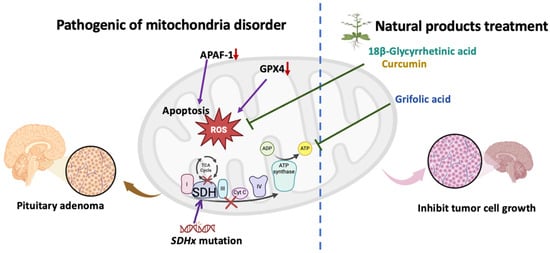 Mutations in mitochondria-related genes, such as SDHB, have been identified in pituitary adenomas, highlighting the significance of genetic and epigenetic changes in their pathogenesis. Mitochondrial dysfunction—which encompasses pathway networks, oxidative stress, and mitochondrial dynamics—has been recognized as a key factor in the development and progression of these tumors (Figure 1). Understanding the molecular mechanisms underlying the onset of pituitary adenomas is crucial for developing targeted therapies and improving patient prognoses. Given the complex relationship between mitochondrial function and pituitary adenomas, mitochondrial-targeted therapy has emerged as a promising approach for treatment, potentially leading to more effective and personalized strategies for patients facing these challenging conditions. Natural compounds have been reported to disrupt biological systems in various in vitro and in vivo disease models [], demonstrating significant application value in both chemical biology and medicine []. In this review, we summarize natural compounds with therapeutic potential for treating pituitary adenomas, emphasizing that substances such as curcumin, grifolic acid, glycyrrhetinic acid, and matrine can modulate mitochondrial bioenergetics in different ways, thereby preventing mitochondrial oxidative stress-induced cell proliferation (Figure 1).