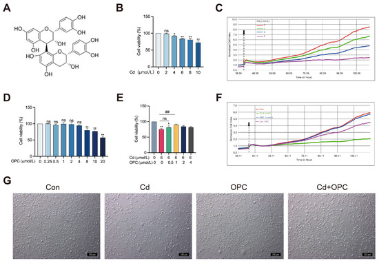OPC alleviates Cd-induced cytotoxicity in MLO-Y4 cells. The chemical structure of OPC (A), MLO-Y4 cells were exposed to various concentrations of Cd or OPC for 24 h. Cell viability was detected using CCK8 assay (B,D) and RTCA (C) (The black arrow indicates the point in time when Cd exposure began). MLO-Y4 cells were pretreated with OPC for 2 h, followed by exposure to 6 μmol/L Cd for 24 h. Cell viability was evaluated using CCK-8 assay (E) and RTCA (F) (The black arrow indicates the point at which the Cd treatment began), and morphological changes were examined by phase-contrast microscopy (G). Scale bar = 100 μm. Results are shown as mean ± SD (n = 3). Compared with the control group, * p < 0.05, ** p < 0.01, or ns represent p > 0.05. Compared with the Cd group, ## p < 0.01, or ns represent p > 0.05.