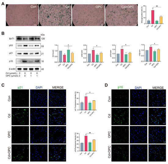 To explore whether Cd induces senescence of osteocytes in vitro, we used hydrogen peroxide-treated cells as a positive control. We first evaluated cellular senescence markers and found that Cd exposure induced osteocyte senescence (Figure S1A–F). The results of time-course experiments showed that Cd exposure for 24 h induced osteocyte senescence (Figure S1G–L). Next, we evaluated the protective effect of OPC on Cd-induced osteocyte senescence. Compared with the Cd group, SA-β-gal-positive cells were significantly reduced (Figure 2A), the expression of senescence markers (p53, p21, and p16) was reduced, and the expression of the senescence defense protein SirT1 was increased in the Cd + OPC group (Figure 2B). Immunofluorescence analysis showed that the fluorescence intensities of p21 and p16 were significantly reduced after OPC treatment (Figure 2C,D). Collectively, these results demonstrate that OPC can alleviate Cd-induced senescence of MLO-Y4 cells.