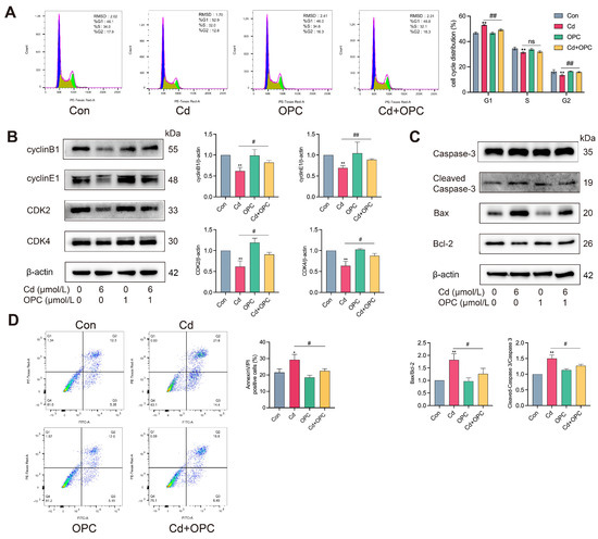 OPC alleviated Cd-induced cell cycle arrest and apoptosis. MLO-Y4 cells were pretreated with 1 μmol/L OPC for 2 h, followed by exposure to 6 μmol/L Cd for 24 h. Cell cycle distribution was detected by flow cytometry (A). The protein expression of cyclinB1, cyclinE1, CDK2, CDK4, caspase-3, Bax, BCL-2 and the levels of cleaved caspase-3 were detected by Western blot (B,C). Cell apoptosis was detected by flow cytometry (D). Results are shown as the mean ± SD (n = 3). Compared with the control group, * p < 0.05, ** p < 0.01, or ns represent p > 0.05. Compared with the Cd group, # p < 0.05, ## p < 0.01, or ns represent p > 0.05.