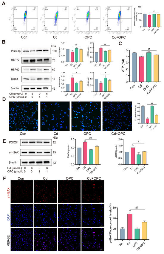 OPC alleviates Cd-induced mitochondrial dysfunction and DNA damage. MLO-Y4 cells were pretreated with 1 μmol/L OPC for 2 h, followed by exposure to 6 μmol/L Cd for 24 h. Mitochondrial membrane potential was detected by the JC-1 probe using flow cytometry (A). The protein expression of PGC-1β, HSP70, HSP60, and COX4 was detected by Western blot (B). ATP content were detected by ATP assay kit (C). DNA replication ability was detected by EdU staining (D). Scale bar = 50 μm. The expression of FOXO1 and γ-H2AX was detected by Western blot (E). Immunofluorescence analysis showed nuclear distribution and intensity of γ-H2AX foci (F). Scale bar = 100 μm. Results are shown as the mean ± SD (n = 3). Compared with the control group, * p < 0.05, ** p < 0.01. Compared with the Cd group, # p < 0.05, ## p < 0.01.