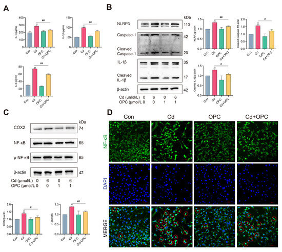 OPC reduces Cd-induced SASP production by inhibiting the NF-κB pathway. MLO-Y4 cells were pretreated with 1 μmol/L OPC for 2 h, followed by exposure to 6 μmol/L Cd for 24 h. The levels of IL-1, IL-1β, and IL-6 intracellularly were detected by ELISA kits (A). The expression of NLRP3, Cleaved Caspase-1, Cleaved IL-1β, COX2, NF-κB, and p-NF-κB was detected by Western blot (B,C). NF-κB nuclear translocation in MLO-Y4 cells was observed using immunofluorescence, red circles represent cells with NF-κB nuclear translocation (D). (Red circles represent cells with positive NF-κB nuclear translocation). Scale bar = 100 μm. Results are shown as the mean ± SD (n = 3). Compared with the control group, ** p < 0.01. Compared with the Cd group, # p < 0.05, ## p < 0.01.