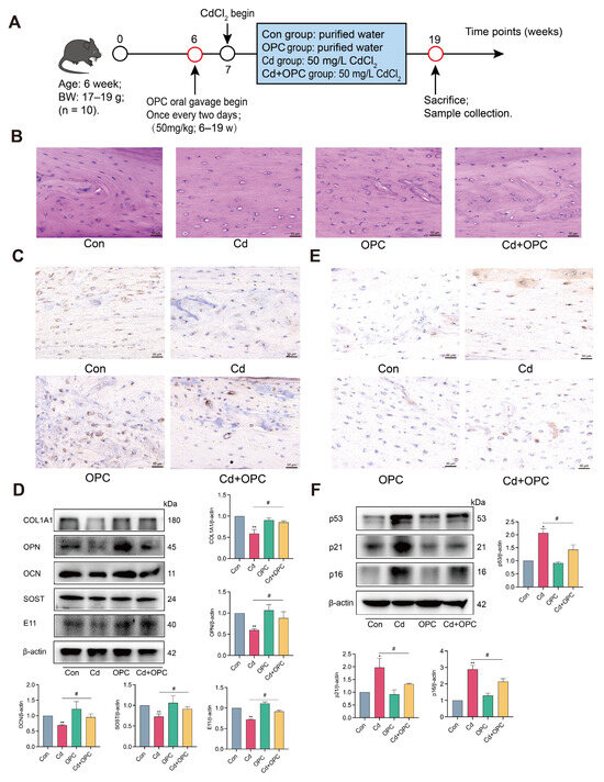 To evaluate the protective effects of OPC against Cd-induced osteocyte senescence in vivo, we established a mouse model with chronic Cd exposure and OPC supplementation over a 90-day period (Figure 8A). Histological analysis revealed that Cd exposure led to an increase in the number of blank osteocyte compartments in the femur, indicating a reduction in the total number of osteocytes, while OPC supplementation relieved this result (Figure 8B). Immunohistochemical and Western blot analysis demonstrated that OPC treatment preserved the population of SOST-positive osteocytes and maintained the expression of key osteocyte-function proteins, including COL1A1, OPN, OCN, SOST, and E11 (Figure 8C,D). Furthermore, OPC significantly reduced both the accumulation of the senescence marker p16 in femoral osteocytes and the expression levels of senescence-associated proteins p53, p21, and p16 (Figure 8E,F). These results demonstrate that OPC effectively attenuates Cd-induced osteocyte senescence in vivo.