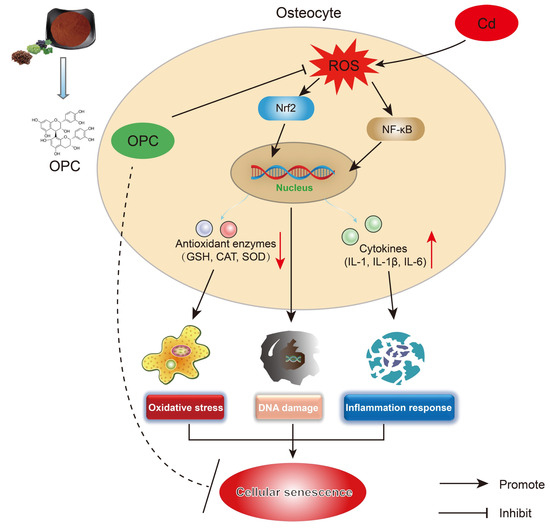 In conclusion, our study demonstrates that OPC effectively attenuates Cd-induced premature senescence in osteocytes by suppressing oxidative stress, inflammatory response, and DNA damage (Figure 9). There are still some limitations in our research, and it is necessary to use genetic approaches to further validate the relevant mechanisms in the future. Overall, this study provides the first evidence of Cd-induced osteocyte senescence and dysfunction, and establishes OPC as a promising therapeutic agent for preventing Cd-mediated osteotoxicity. These findings not only improve our understanding of the molecular mechanisms of cadmium-induced bone disease, but also provide a foundation for the development of interventions based on natural compounds.