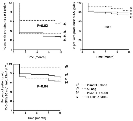 Patients with MN (285 overall) were studied at diagnosis and during a long follow-up of 46 months with multiple clinical approaches. At diagnosis, 182 (64%), 8 (3%), and 95 (33%) patients were anti-PLA2R1+, anti-THSD7A+ and double-negative, respectively. Kaplan–Meier analysis showed that anti-PLA2R1 and anti-SOD2 antibodies at diagnosis were each independently associated with poor clinical outcomes. Combined positivity for anti-PLA2R1 and anti-SOD conferred maximal risk.