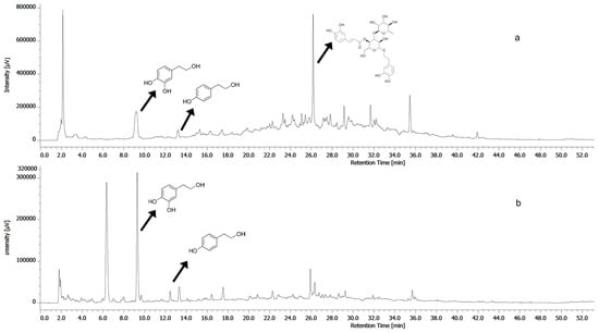 Figure 1 shows the hydrolyzed and non-hydrolyzed HPLC profiles of OPFE at 280 nm. Owing to the presence of several secoiridoidic molecules, which are precursors of OH-Tyr and Tyr units, we applied acidic hydrolysis to break the more complex molecules into their simpler constituents [].