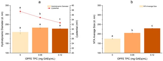 Effect of OPFE concentration on the DLS hydrodynamic diameter of the main peak and ζ-potential of NPs (a) and on the NTA average size (b). Different lowercase letters indicate significant differences (p ≤ 0.05). Color variations refer to increasing OPFE concentrations (GAEq/mL) used for NPs preparation.