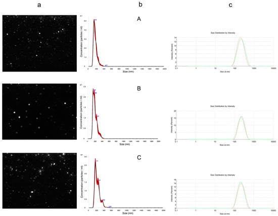 NTA video frame (row a), finite track length adjustment (FTLA) concentration/size graph of particles (row b), and DLS intensity distributions (row c) of empty NPs (A), 0.08 mg GAEq/mL NPs (B), and 0.12 mg GAEq/mL NPs (C). Different colors in row c refer to different experimental replicates.