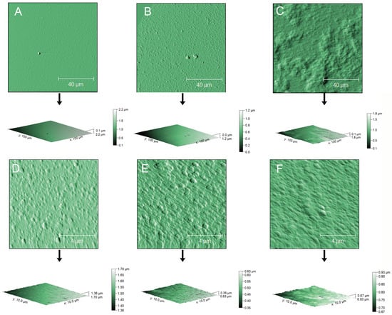 Semi-contact AFM analysis of empty NPs (A,D) and NPs containing 0.08 mg GAEq/mL (B,E) or 0.12 mg GAEq/mL (C,F). The dimensions of the scanning areas were 100 × 100 µm for panels A–C and 10 × 10 µm for panels D–F. Samples were diluted 1:5 using double-deionized water and allowed to settle on muscovite micas for at least 10 min before drying through argon flow immediately before scanning.