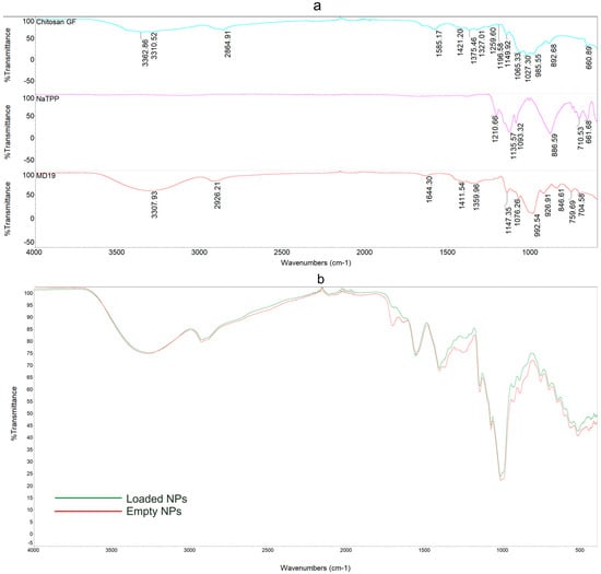 Stacked ATR-FTIR spectra of CS, NaTPP, and MD-19 with peak absorption (a) and overlayed ATR-FTIR spectra of loaded (0.12 mg GAEq/mL) and empty NPs (b).