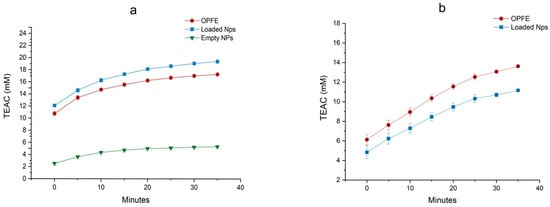 OPFE and OPFE NP antioxidant capacity (AOC) was evaluated through an ABTS radical-scavenging assay following the method proposed by Fierri et al. [], with a few modifications. Briefly, the ABTS working solution was produced by mixing a 7 mM ABTS solution with a 2.6 mM potassium persulfate solution in equal quantities and allowing the mixture to react for 12 h in the dark. The radical solution was then diluted with 10 mM sodium acetate buffer, pH 4.0, to reach an absorbance of 0.75 at 734 nm immediately before the analysis. The assay was performed on a 96-well microplate (Sarstedt, Nümbrecht, Germany) by mixing 20 μL of standard extract or NPs with 200 μL of ABTS and subsequently incubating the plate in the dark. Absorbance decreases at 734 nm were measured every 5 min for a total of 35 min. The results were expressed as Trolox-equivalent antioxidant capacity (TEAC, mM) using a Trolox calibration curve from 0.5 mM to 0.015 mM.