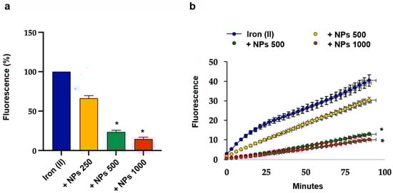 Radical-scavenging effect of the NPs on the ascorbate-driven Fenton reaction. (a) Bar graph showing the dose-responsive inhibitory effect of the NPs on the Fenton reaction at 90 min. (b) Representative graph showing the fluorescence over time induced by ammonium iron (II) sulfate (iron (II)) and by increasing concentrations of NPs added to iron (II). Data represent the mean ± SD of measurements performed in triplicate in three different experiments: * p < 0.001 decrease vs. iron (II).