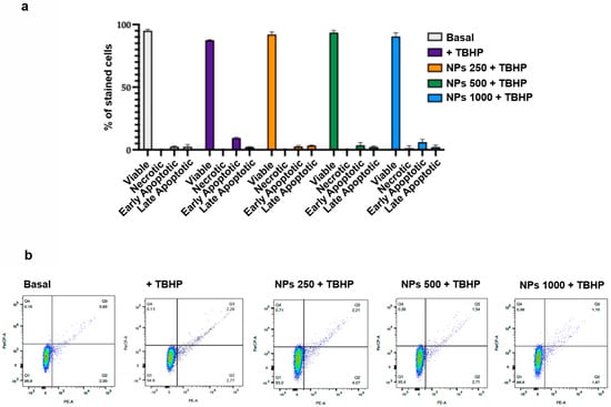 Flow cytometric analysis of the viability of THP-1 cells exposed to oxidative stress and NPs. THP-1 cells were preincubated with increasing concentrations of NPs (from 250 to 1000 µg/mL) before the addition of TBHP (100 µM). (a) Bars show the cell viability of control cells, of TBHP, and of NPs (from 250 to 1000 µg/mL). Colors refer to the different samples. Data represent the mean ± SD of measurements performed in triplicate in three different experiments. (b) Representative flow cytometry analysis of the effect of control treatment, of TBHP, and of increasing concentrations of NPs on cell viability. Q1: viable cells, Q2: early apoptotic cells, Q4: late apoptotic cells, Q4: necrotic cells.
