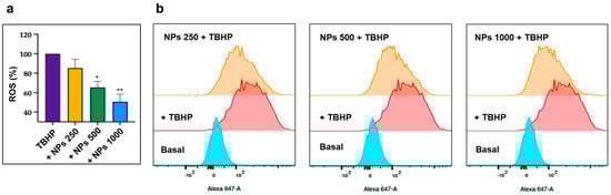 Dose-responsive inhibitory effect of NPs on oxidative stress-induced intracellular reactive oxygen species (ROS) formation. (a) Bars show the dose-responsive antioxidant effect of the NPs. THP-1 cells were preincubated with increasing concentrations of NPs (from 250 to 1000 µg/mL) before the addition of TBHP (100 µM). Data represent the mean ± SD of measurements performed in triplicate in three different experiments: * p < 0.01 decrease vs. THBP; ** p < 0.001 decrease vs. THBP. (b) Representative flow cytometry analysis of ROS generation induced by TBHP and the inhibitory effect of the different concentrations of NPs.