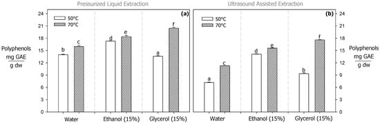 Total polyphenol content in extracts obtained by PLE (a) and UAE (b). Polyphenol content is expressed as mg of gallic acid equivalent (GAE) per gram dry weight (g dw). Different letters indicate significant differences (p < 0.05) between the extraction solvents for each extraction process.