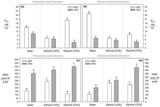 Polyphenols present hydroxyl (OH) groups and can transfer hydrogen atoms to reduce the DPPH radical [54]. In this sense, a high potential of radical inhibition in an extract is related with a high polyphenol content. For both PLE and UAE, the IC50 values decreased with increasing temperature. Under subcritical and ultrasound-assisted conditions, the amount of extract necessary to decrease DPPH radical activity by 50% (IC50) was 10.2, 6.5, and 4.1 mg/mL (Figure 2a) for pure water, 15% water–ethanol, and 15% water–glycerol mixtures, respectively, and 7.2, 5.4, and 4.7 mg/mL (Figure 2b) for the same mixtures during the PLE process, respectively. Interestingly, the optimal condition to inhibit 50% of DPPH radical activity was the 15% water–glycerol mixture at 70 °C for both PLE and UAE, with no significant differences observed (p > 0.05) (Figure 2a,b). A similar behavior was reported by Huaman et al. [47] who found that an increase from 90 to 150 °C reduced by 66% and 53% the IC50 value with ethanol (15%) and glycerol (15%), respectively. Mamani-Pari et al. reported [26] that an increase from 50 to 70 °C reduced by 72% and 33% the IC50 value with pure water and ethanol (30%), respectively.