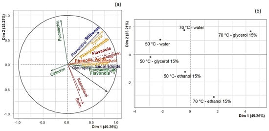 For the PLE process, Principal Component Analysis (PCA) presents the distribution of various phenolic compounds based on the first two principal components, which together account for 74.47% of the total variance (Figure 3a). Higher temperatures (70 °C) enhance the extraction of flavonols, which are located closer to the origin of the coordinate system (Figure 3b). Additionally, more polar solvents, such as water, preferentially extract polar compounds like flavonols and phenolic acids. In contrast, solvents such as ethanol and glycerol are more effective at extracting less polar compounds like stilbenes (Figure 3b).