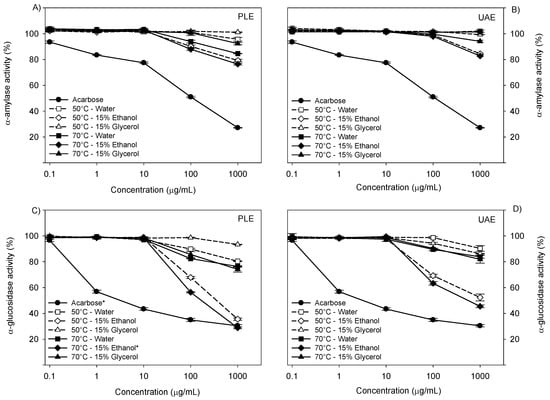 PLE and UAE extracts exhibited low α-amylase inhibitory activity as the temperature increased from 50 to 70 °C (Figure 4). For PLE at 70 °C, the inhibition values were 15% for the pure water extract, 8% for the 15% water–ethanol extract, and 24% for the 15% water–glycerol extract at 1000 µg/mL (Figure 4A). UAE extracts obtained with pure water at 70 °C and 1000 µg/mL showed no inhibition of the enzyme. Additionally, the water–ethanol and water–glycerol mixtures exhibited inhibitions of 17% and 6% in α-amylase activity, respectively (Figure 4B). In contrast, acarbose demonstrated a significantly higher inhibition of 73% at the same concentration.