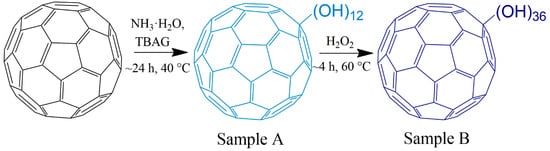 Figure 1 shows the process of two-stage hydroxylation of fullerene C60. This procedure was described earlier [30] and is the formation of low-hydroxylated fullerenol in the first stage of the process and its subsequent hydroxylation by treatment with hydrogen peroxide in the second stage. We have experimentally established that by varying the concentration of peroxide, it is possible to obtain fullerenols with different degrees of hydroxylation. In this investigation, a solution of 20 wt.% of hydrogen peroxide was used to obtain fullerenol with 36 hydroxyl groups. Sample A was found to be insoluble in water, while Sample B had a solubility of ~60 mg/mL.