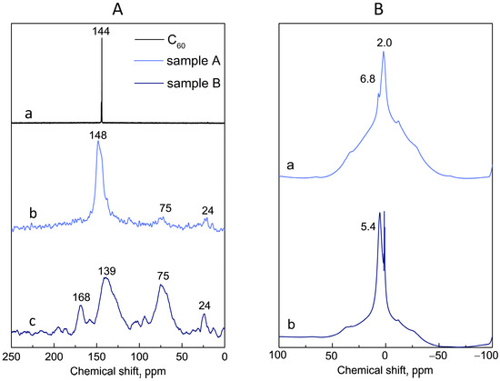 The chemical shift of unmodified sp2-hybridized carbon atoms of fullerene C60 corresponds to a value at 144 ppm [27], as can be seen in Figure 2A, curve (a). The narrow well-resolved signal in the 13C solid-state NMR spectrum of fullerene C60 appears due to the rapid rotation of the fullerene molecules and the effective averaging of the dipole–dipole interactions of the magnetic moments of the carbon atoms, as in the case of liquid-state NMR. As shown in Figure 2A (curves b and c), several signals are observed for Samples A and B. The fullerene modification with hydroxyl groups leads to a substantial broadening of the signal at 144 ppm due to the significant inhomogeneity of the electronic structure of fullerenol associated with the redistribution of sp2- and sp3-hybridized carbons [35,36]. The 13C CP MAS NMR spectra of Samples A and B contain signals at 75 and 25 ppm, which correspond to sp3 carbons with singly attached OH groups [27,37,38,39] and carbon (C–H) adjacent to the hydroxyl group [40], respectively. Sample B may also contain a small amount of pair-grafted hydroxyls, the signal of which at about 80 ppm [35] overlaps with a broad maximum at 75 ppm. The appearance of a signal in the spectrum of Sample B at 168 ppm may indicate the presence of a small number of carboxyl groups [39,41], which can be pH-dependently reversibly formed in fullerenols [27].