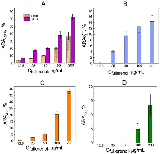 As can be seen in Figure 4, the activity of fullerenol C60(OH)36·10H2O against DPPH, superoxide, hydroxyl radicals, and singlet oxygen has a concentration dependence, which is consistent with the data known for fullerenols with varying degrees of hydroxylation and fullerenol nanocomposites [15,17,58,59,60,61,62]. At the same time, fullerenols at concentrations below 100 μg/mL did not exhibit antioxidant activity against singlet oxygen (Figure 4D).