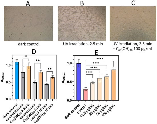 Protective effects of fullerenol against UV irradiation. (A) Morphology of MDCK cells without fullerenol in dark control. (B) Morphology of MDCK cells after UV irradiation for 2.5 min. (C) Morphology of MDCK cells under UV irradiation for 2.5 min in the presence of 100 μg/mL fullerenol. (D) Protective effect of fullerenol on cells in culture against UV phototoxicity. Fullerenol concentration is 50 µg/mL, and irradiation time is 2.5 ÷ 10 min. After irradiation, the cells were incubated for 18–20 h in the dark. * p < 0.05; ** p < 0.001 (E) Effect of fullerenol concentration on UV-mediated toxicity in vitro. Irradiation time: 7 min. **** p < 0.0001. Values are expressed as the mean ± S.D. (n ≥ 6).