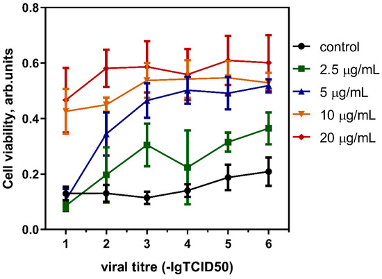 The results of the study of the antiviral activity of fullerenol against the A/California/07/09 (H1N1)pdm09 strain by the MTT assay are presented in Figure 7. The antiviral effect was expressed in a decrease in the cytopathogenic effect of the virus and an increase in cell viability (integral activity of respiratory enzymes) in the presence of the virus in 10-point dilutions from 1 to 6. In accordance with the obtained SI values, it turned out that fullerenol C60(OH)36·10H2O exhibited moderate antiviral activity against influenza A(H1N1) and A(H3N2) viruses. If the IC50 is lower than the CC50, the virus will be neutralized before causing damage to host cells, and they will not experience any side effects when treated with fullerenol.