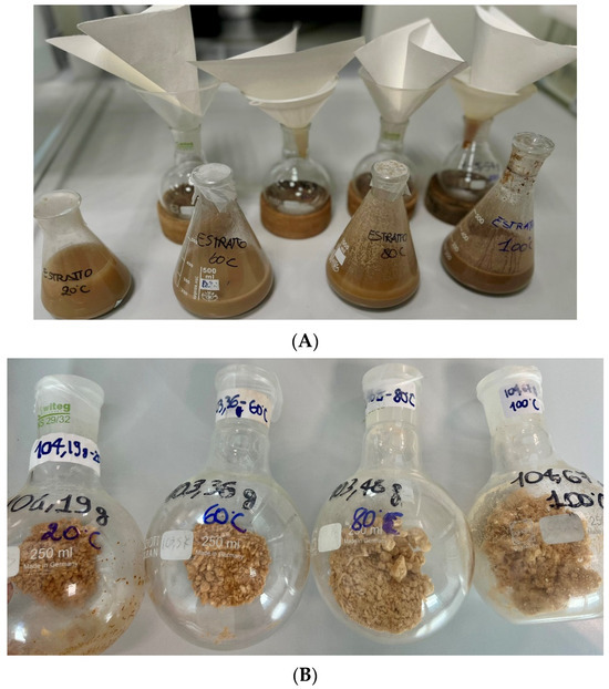 For the extraction, 20 g of acorn flour was mixed with 200 mL of water, maintaining a 1:10 (flour/water) ratio and then extracted at 20 °C, 60 °C, 80 °C, and 100 °C under magnetic stirring for 30 min. Once the extraction was complete, the solution was filtered through filter paper to separate any solid materials and the resultant liquid extract was collected (Figure 1). This extract was then freeze-dried and stored at −20 °C in the dark until further analysis. The extraction yields of the four extracts were, respectively, of 4.7%, 4.5%, 3.9% and 3.7% for 60 °C, 20 °C, 80 °C, and 100 °C, expressed as w/w dry weight.