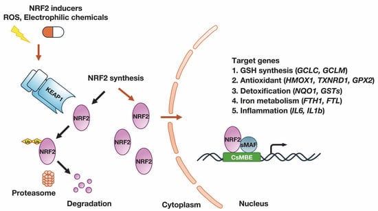 As summarized in Figure 2, NRF2 upregulates the expression of numerous genes that contain CsMBEs in their regulatory regions [41]. In the early stages of research, NRF2 was found to stimulate the expression of genes involved in antioxidant functions. For instance, NRF2 regulates genes involved in heme metabolism and iron metabolism, such as HMOX1 (heme oxygenase-1 (HO-1)), FTH1 (ferritin heavy chain), and FTL (ferritin light chain) genes. NRF2 also regulates antioxidant genes, such as TXNRD1 (thioredoxin reductase 1) and PRDX1 (peroxiredoxin 1) [42,43,44,45,46].