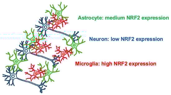Immunohistochemical studies have identified that NRF2 is predominantly expressed in glial cells in the brain [69,70,71]. RNA sequencing analyses have further revealed that microglia and astrocytes express high and moderate levels of NRF2 mRNA, respectively, compared to neuronal cells [9,10,72] (Figure 3). These observations suggest that neurons have a weaker stress response capacity than glial cells. It has been suggested that this expression profile results from the epigenetic inactivation of the NRF2 gene regulatory region early in cortical neuronal development [73]. Keap1 depletion in astrocytes significantly enhances the expression of NQO1, an NRF2 target gene, whereas Keap1 depletion does not enhance it to the same extent in neurons [74]. Similarly, Keap1 depletion induces NQO1 expression in microglia in AD mouse models [75].