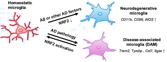 In both the cortices and the hippocampus of AppNLGF::Keap1FA/FA and AppNLGF::Keap1FA/– mouse brains, NRF2 suppresses the transition from homeostatic microglia to DAMs [75,197]. While the expression levels of the homeostatic microglial markers, e.g., Cx3cr1, P2ry12, are slightly elevated in the cortex and hippocampus in AppNLGF mice, these expressions cannot be reduced by NRF2 activation. In contrast, NRF2 activation suppresses the expression of both stage 1 DAM markers, such as Trem2 and Tyrobp, and stage 2 DAM markers, such as Cst7 and Itgax, in AppNLGF mice. AppNLGF::Keap1FA/FA mice also show lower proinflammatory responses and fewer phagocytic cells compared to AppNLGF mice. These observations imply that microglial activation can be suppressed by NRF2 induction. Supporting this notion, a series of behavior analyses showed that genetic NRF2 induction improves impaired cognition. These findings suggest that NRF2 is involved in the shift between homeostatic microglia and DAMs, highlighting the potential of NRF2 inducers as therapeutic targets for AD pathology [75].