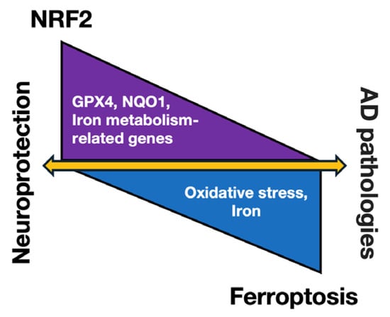 The levels of several NRF2-regulated proteins, such as GPX4-an enzyme involved in GSH biosynthesis, are closely linked to ferroptosis. GPX4, NQO1, and various iron metabolism-related proteins have been found to be altered in AD [205,206]. Activated NRF2 combats oxidative stress induced by excess iron, thereby protecting tissues and cells from ferroptosis [207]. Furthermore, reduced levels of NRF2 mRNA in the brains of AD patients is involved in ferroptosis in AD pathology (Figure 5). Thus, by regulating the genes related to iron and the glutathione metabolism, NRF2 significantly impacts the development of AD [202].