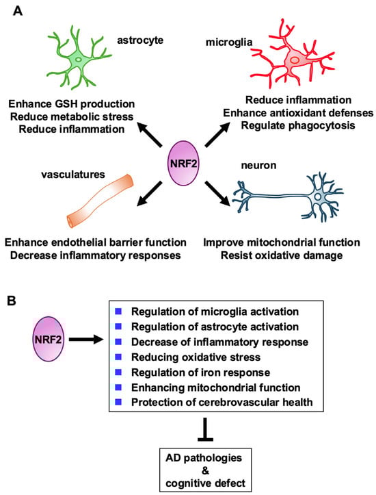 Given the antioxidative and anti-inflammatory functions of NRF2, therapeutic strategies targeting NRF2 could potentially inhibit microglia-mediated neuroinflammation. Recent studies have also highlighted the importance of NRF2 in astrocytes in the context of AD. Activating NRF2 in astrocytes has emerged as a promising therapeutic strategy for addressing both acute neuronal injury and chronic neurodegenerative conditions driven by oxidative stress [119].