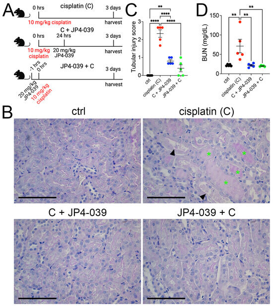Cisplatin-induced kidney injury and loss of function is mitigated by JP4-039. (A) Overview of the cisplatin AKI and JP4-039 administration protocols. Cisplatin was administered to three cohorts of 129Sv-Elite mice; cisplatin cohort (C) received a single dose of cisplatin (10 mg/kg), cohort 2 (C + JP4-039) received a single dose of cisplatin (10 mg/kg), followed by JP4-039 (20 mg/kg) 24 h later, and cohort 3 (JP4-039 + C) was injected with JP4-039 (20 mg/kg) followed by cisplatin (10 mg/kg) 1 h later. Control mice (ctrl) were injected with normal saline and DMSO (vehicles for cisplatin and JP4-039, respectively). Kidneys and blood were collected for analysis 3 days after cisplatin injection. (B) Histological analysis of kidney sections via periodic acid–Schiff (PAS) staining reveals that JP4-039 treatment preserves the kidneys from cisplatin injury. Green asterisks, protein casts; arrowheads, loss of brush-border. Scale bars: 100 μm. (C) Blood urea nitrogen (BUN) measurements demonstrate AKI in cisplatin-only but not in control and JP4-039-treated mice. Ordinary one-way ANOVA with Tukey’s multiple comparison ** p < 0.01, **** p < 0.0001, n = 5 each. (D) Tubular injury scores based on PAS-stained kidney sections. Ordinary one-way ANOVA with Tukey’s multiple comparison ** p < 0.01, n = 5 each. (C,D) Data are presented as the mean ± SEM. A two-way ANOVA with Tukey’s post hoc analysis.
