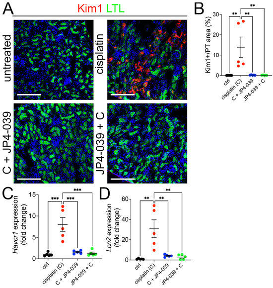 JP4-039 administration mitigated tubular injury in cisplatin AKI. (A) Representative images of Kim1 immunofluorescence staining in control (untreated) and cisplatin ± JP4-039-treated kidneys on day 3 after AKI induction, Kim1 (red), LTL (green), DAPI (blue). Scale bar: 200 μm. (B) Quantification of KIM1-positive area in LTL-positive proximal tubules shows that prophylactic and therapeutic JP4-039 administrations suppresses KIM1 expression in cisplatin-injected kidneys. One way-ANOVA, ** p < 0.01, n = 5 each. (C) Havcr1 expression was increased in cisplatin AKI kidneys but remained at baseline in mice co-administered with JP4-039. One way-ANOVA, *** p < 0.001, n = 5 each. (D) Ngal expression was increased in cisplatin AKI kidneys but remained at baseline in the kidneys of mice co-administered JP4-039. One way-ANOVA, ** p < 0.01, n = 5 each. (B–D) Data are presented as the mean ± SEM. One way-ANOVA with Tukey’s post hoc analysis.