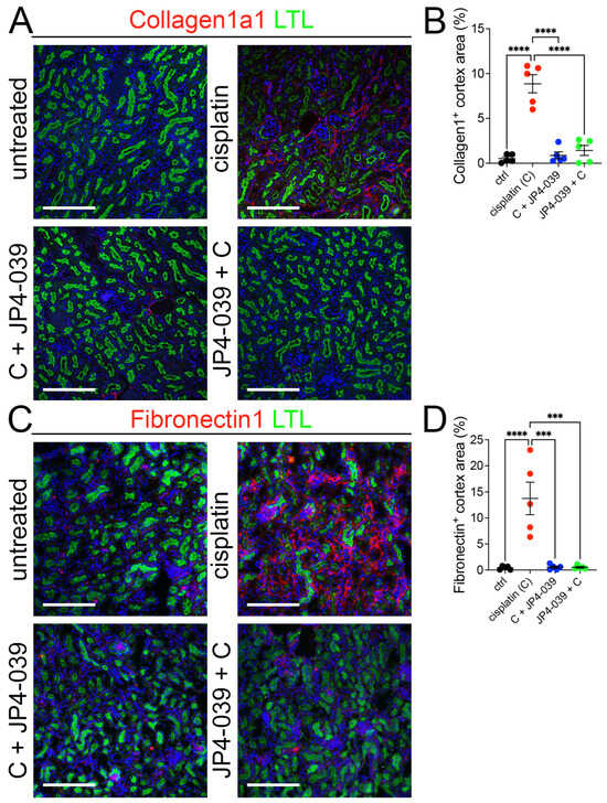 JP4-039 blocked the development of tubular interstitial fibrosis in cisplatin AKI. (A) Representative images of Collagen1 immunofluorescence staining in control (untreated) and cisplatin ± JP4-039-treated kidneys on day 3 after AKI induction; collagen 1a1 (red), LTL (green), and DAPI (blue). Scale bar: 200 μm. (B) Quantification of collagen 1-positive area in the cortical region shows that prophylactic and therapeutic JP4-039 administrations suppress Col1a expression in cisplatin-injected kidneys. One way-ANOVA, **** p < 0.0001, n = 5 each. (C) Representative images of fibronectin 1 immunofluorescence staining in control (untreated) and cisplatin ± JP4-039-treated kidneys on day 3 after AKI induction; fibronectin 1 (red), LTL (green), DAPI (blue). Scale bar: 200 μm. (D) Quantification of fibronectin 1-positive area in the cortical region shows that prophylactic and therapeutic JP4-039 treatments suppress Fn1 expression in cisplatin-injected kidneys. (B,D) Data are presented as the mean ± SEM. One way-ANOVA, *** p < 0.001, **** p < 0.0001, n = 5 each.