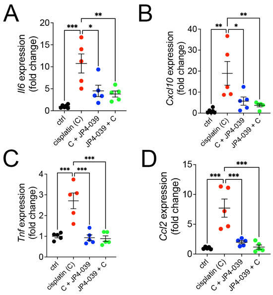JP4-039 treatment reduced intrarenal infiltration of inflammatory cells triggered by tubular cell death. (A–D) Evaluation of the expression of several inflammatory genes—Il6 (A), Cxcl10 (B), Tnf (C), and Ccl2 (D) by qPCR reveals a robust inflammatory signaling in cisplatin AKI, which is suppressed in mice co-treated with JP4-039. (A–D) Data are presented as the mean ± SEM. One way-ANOVA with Tukey’s post hoc analysis, * p < 0.05, ** p < 0.01, *** p < 0.001, n = 5 per group.