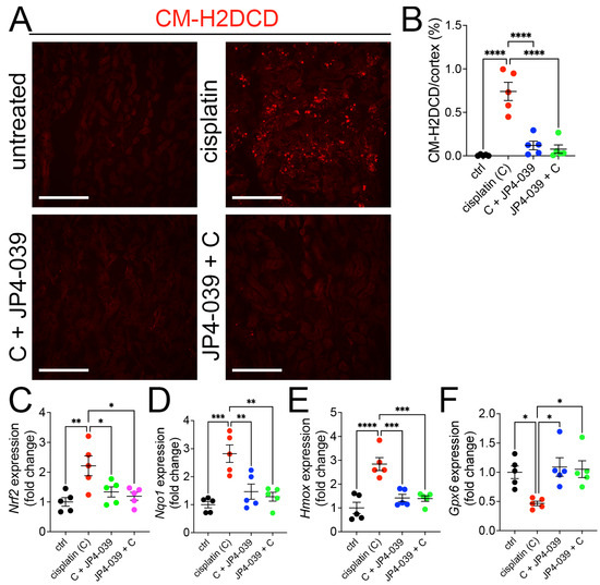 JP4-039 blocked the generation of reactive oxygen species (ROS) and activation of the Nrf2 antioxidant pathway in cisplatin-treated kidneys. (A) CM-H2DCFDA staining in untreated and cisplatin ± JP4-039-treated kidneys. Scale bar: 200 μm. (B) Quantification of the CM-H2DCFDA. **** p < 0.0001, n = 5. (C–F) Expression of Nrf2 (C) and its target genes, Nqo1 (D) and Hmox (E), was increased in cisplatin AKI kidneys but remained at baseline in mice co-administered with JP4-039, while Gpx6 (F) expression was reduced in AKI kidneys but preserved at baseline in JP4-039 administered kidneys. One way-ANOVA, * p < 0.05, ** p < 0.01, *** p < 0.001, **** p < 0.0001, n = 5 each. (B–F) Data are presented as the mean ± SEM. One way-ANOVA with Tukey’s post hoc analysis.