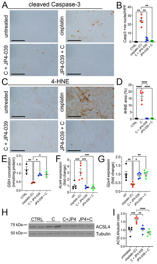 JP4-039 reduced apoptosis and ferroptosis in tubular epithelial cells in cisplatin-injured kidneys. (A) Representative images of cleaved Caspase-3 immunohistochemistry staining in untreated and cisplatin ± JP4-039-treated kidneys. Scale bar: 100 μm. (B) Quantification of cleaved Caspase-3 positive cells in the kidney cortex. ** p < 0.01, n = 5 per group. (C) 4-Hydroxynonenal (4-HNE) staining in control and AKI ± JP4-039 kidneys showed that JP4-039 mitigated the cisplatin-induced accumulation of lipid peroxidation in kidneys 3 days after cisplatin administration. Scale bar: 100 μm. (D) Quantification of 4HNE positive area in the kidney cortical area. **** p <0.0001, n = 5 per group. (E) Quantification of free GSH concentration in whole kidney lysates. * p < 0.05, ** p < 0.01, n = 3 per group. (F,G) qPCR analysis of Acsl4 and Gpx4 expression in kidneys normalized to Gapdh, * p < 0.05, ** p < 0.01, *** p < 0.001, n = 5 per group. (H,I) Western blot and quantification of kidney Acsl4 protein. Tubulin is a loading control. ** p < 0.01, *** p < 0.001, **** p <0.0001, n = 5 per group. (B,D–F,G,I) Data are presented as the mean ± SEM. One way-ANOVA with Tukey’s post hoc analysis.