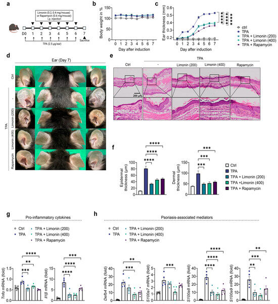 Limonin alleviates symptoms of TPA induced psoriasis-like mouse model and inhibits amplification of psoriasis-associated genes. (a) Experimental design for the induction of TPA-induced psoriasis-like mouse model. The mice (n = 4–6/group) were divided into five groups. (b) Mouse body weight change calculated as a percentage of the initial weight. (c) Ear thickness was measured 24 h after TPA application using a dial thickness gauge. (d) Representative photographs of mouse ears from each treatment group on day 7. (e) Representative photomicrographs of ear sections stained with hematoxylin and eosin (H&E) (×200 magnification; scale bar = 200 µm). (f) Epidermal and dermal thicknesses were measured using microphotographs of H&E-stained ear tissues. (g,h) Gene expression of pro-inflammatory cytokines (Tnfα and Il1β), and psoriasis-related antibacterial peptides (Defb4, LCN, S100a7, S100a8, and S100a9) in the ear skin of TPA and limonin or rapamycin-treated psoriasis-like mice; the ear skin was excised on day 7. Gene expression was analyzed using qPCR. The gene expression levels were normalized to that of β-actin. All data are presented as the mean ± SEM of four independent experiments. Values were analyzed by Holm–Šídák post-hoc test. ** p < 0.01, *** p < 0.001, **** p < 0.0001 vs. TPA-induced group. TPA: 12-O-tetradecanoylphorbol-13-acetate; H&E: hematoxylin and eosin; SEM: standard error of the mean; Defb4: defensin β 4; S100a7: S100 calcium-binding protein A7; S100a8: S100 calcium-binding protein A8; S100a9: S100 calcium-binding protein A9.