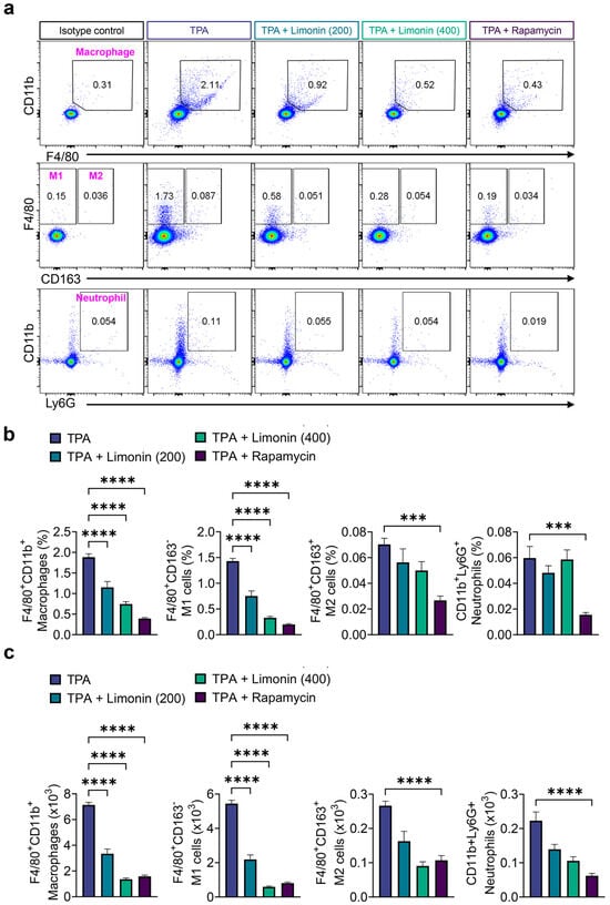 Key players in initiating the inflammatory response in psoriasis are myeloid innate immune cells, such as macrophages, which are present in high density in the skin, contribute to the pathogenesis of psoriasis, and influence the activity of other immune cells [27]. Therefore, we investigated the effect of limonin on myeloid cells in the skin of TPA-induced psoriasis-like mice using flow cytometry. Limonin significantly suppressed the TPA-induced increase in macrophage (F4/80+CD11b+) expansion, similar to rapamycin. Furthermore, limonin significantly inhibited the pro-inflammatory M1 (F4/80+CD163-) phenotype of macrophages, but did not induce a switch to the anti-inflammatory M2 (F4/80+CD163+) phenotype, and did not suppress the increase in neutrophils (Ly6G+CD11b+) (Figure 2a–c).