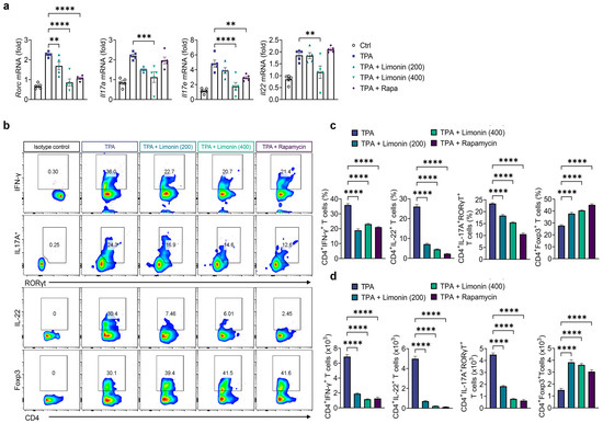 To investigate the effects of limonin on T cell-driven inflammation in a mouse model of TPA-induced psoriasis, we assessed its effects on T cell subpopulations and cytokine expression using qPCR and flow cytometry. Mice with TPA-induced psoriasis showed increased gene expression of both the Th17 transcription factor, RORC, and Th17-produced cytokines, Il17a, Il17e, Il17f, and Il22, in the ear tissue compared with those in normal mice. Additionally, limonin significantly suppressed Th17-related gene expression (Figure 3a). Furthermore, we isolated single cells from the skin of all mouse groups and examined the suppressive effects of limonin on Th1 and Th17 immune responses using intracellular cytokine staining. TPA-induced expansion of Th1 (CD4+IFN-γ+) and Th17 (CD4+IL-17A+RORγt+ and CD4+IL-22+) cells was significantly reduced in skin cells from TPA-induced mice treated with limonin and rapamycin, while simultaneously upregulating regulatory T cells (Treg, CD4+Foxp3+) (Figure 3b–d). These results suggest that limonin modulates T cell responses, thereby enhancing the anti-inflammatory effects on skin cells.