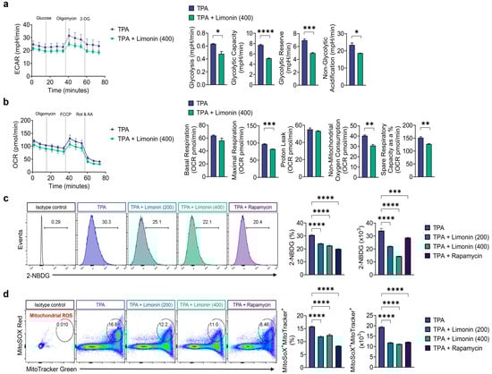 Limonin suppresses glycolysis, oxidative phosphorylation, and mitochondrial ROS in the skin of TPA-induced psoriasis mice. (a) Measurement of ECAR using a seahorse metabolic analyzer in ear skin cells from each group (left panel). Bar graphs show quantification of glycolysis, glycolytic capacity, glycolytic reserve, and non-glycolytic acidification (right panel). (b) Measurement of OCR using a Seahorse metabolic analyzer in ear tissue cells from each group (left panel). Bar graphs show quantification of basal respiration, maximal respiration, proton leak, non-mitochondrial oxygen consumption, and spare respiratory capacity (right panel). (c) Representative histograms of glucose uptake in ear tissue cells measured by using 2-NBDG (left panel) and bar graphs showing quantification of 2-NBDG in percentage and cell numbers (right panel). (d) Representative flow cytometry plots (left panel) showing mitochondrial ROS levels, as measured by MitoSOX Red, and mitochondrial mass, as measured by MitoTracker Green; bar graphs showing quantification of MitoSOX+ MitoTracker+ in percentage and cell numbers (right panel). All data are presented as mean ± SEM of four independent experiments. Statistical significance was determined using the Holm–Šídák post-hoc test. * p < 0.05, ** p < 0.01, *** p < 0.001, and **** p < 0.0001 vs. TPA-induced group. TPA: 12-O-tetradecanoylphorbol-13-acetate; OCR: oxygen consumption rate; ECAR: extracellular acidification rate; 2-NBDG: 2-[N-(7-Nitrobenz-2-oxa-1,3-diazol-4-yl) Amino]-2-Deoxyglucose.